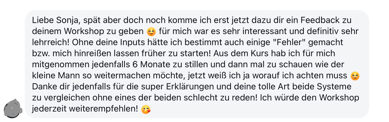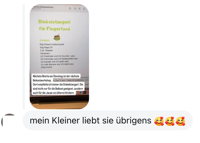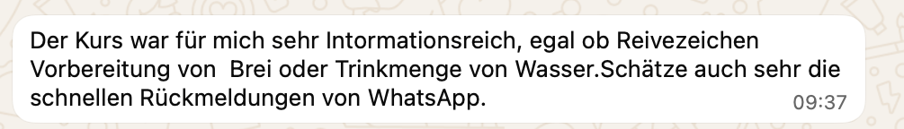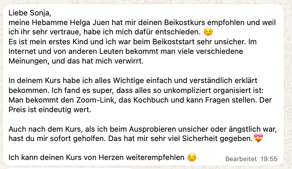 Genau dafür gibt es den Kurs. Du wirst Schritt für Schritt begleitet und bekommst eine klare Orientierung, damit du bei jedem Löffel weißt: Ich mache das gut. Und es passt zu uns.